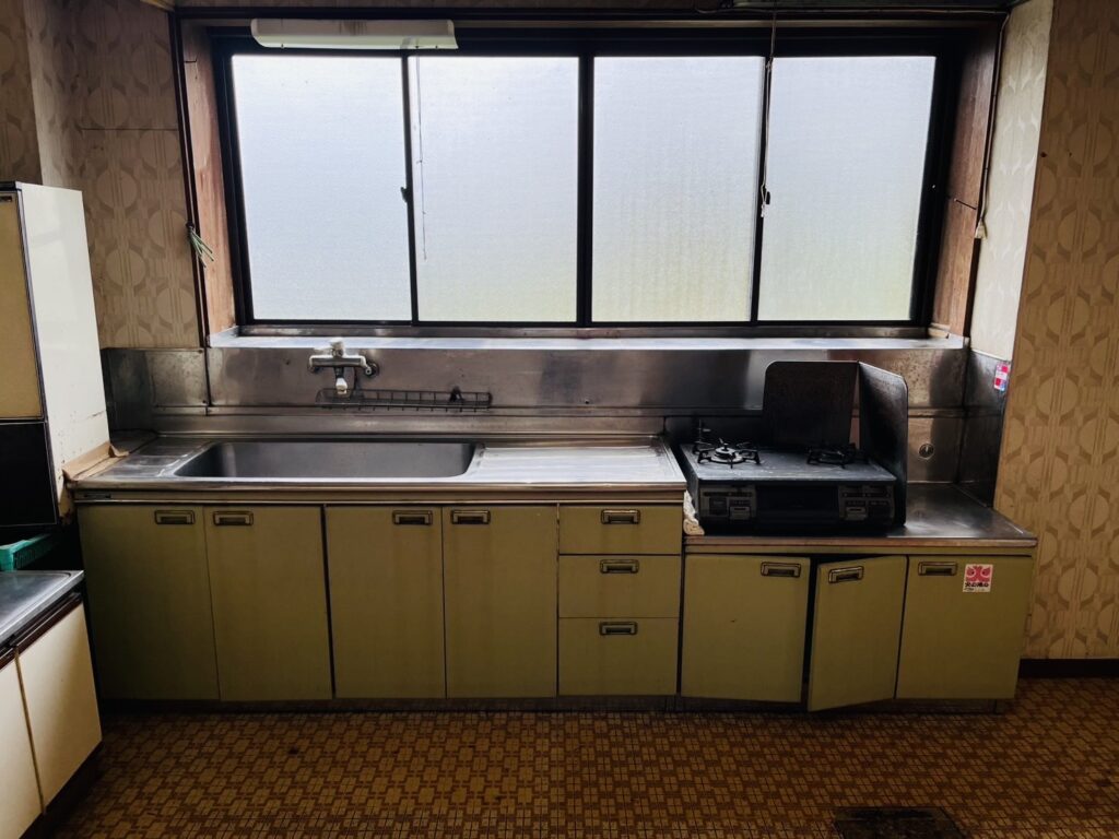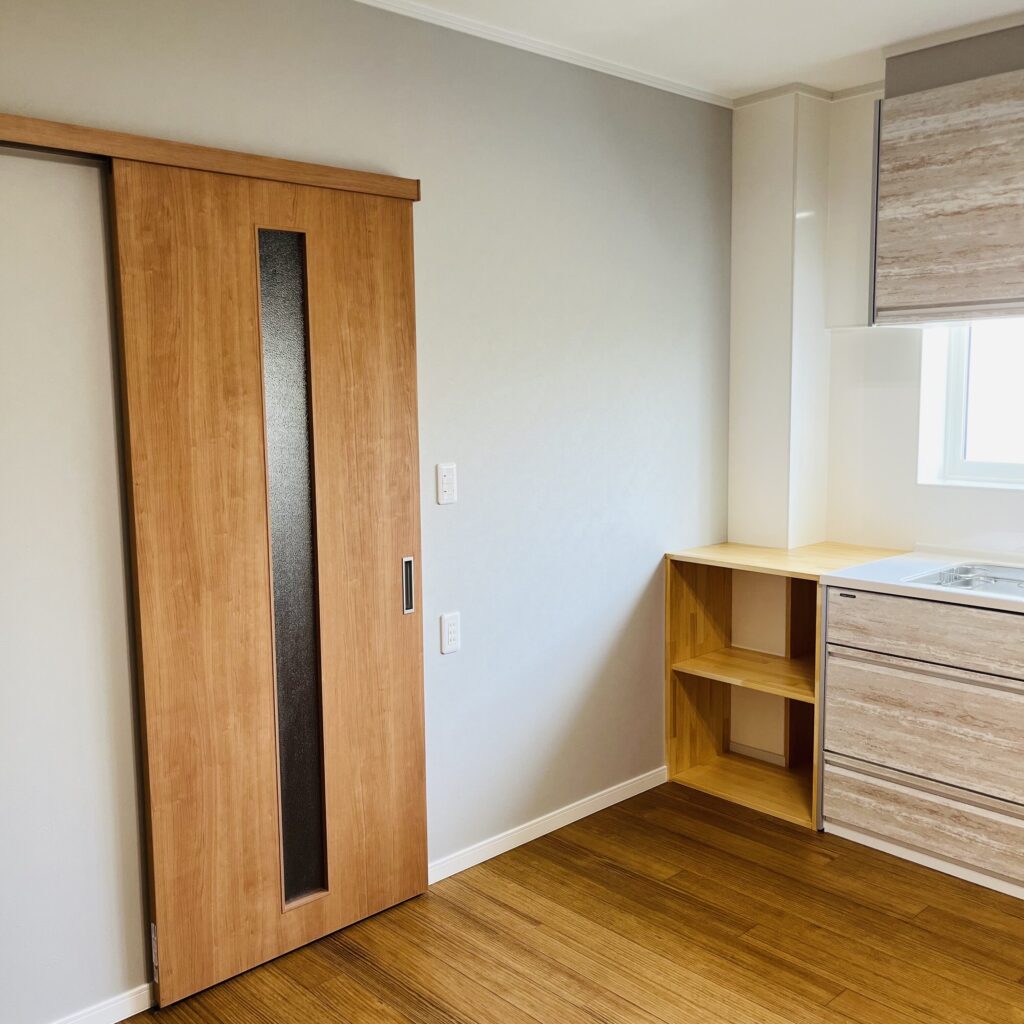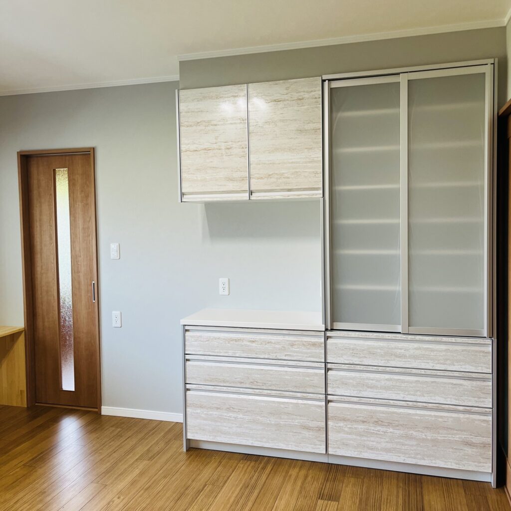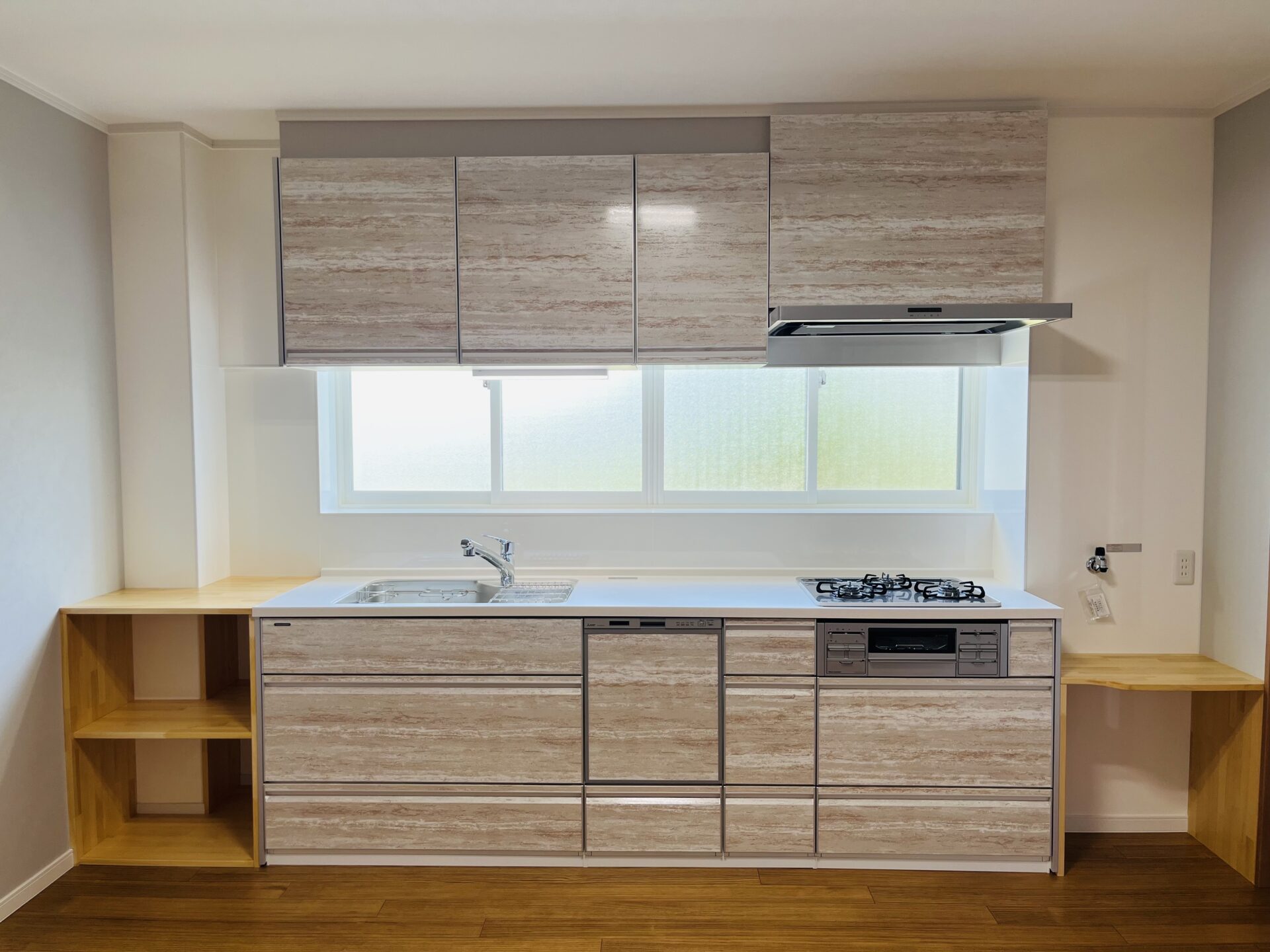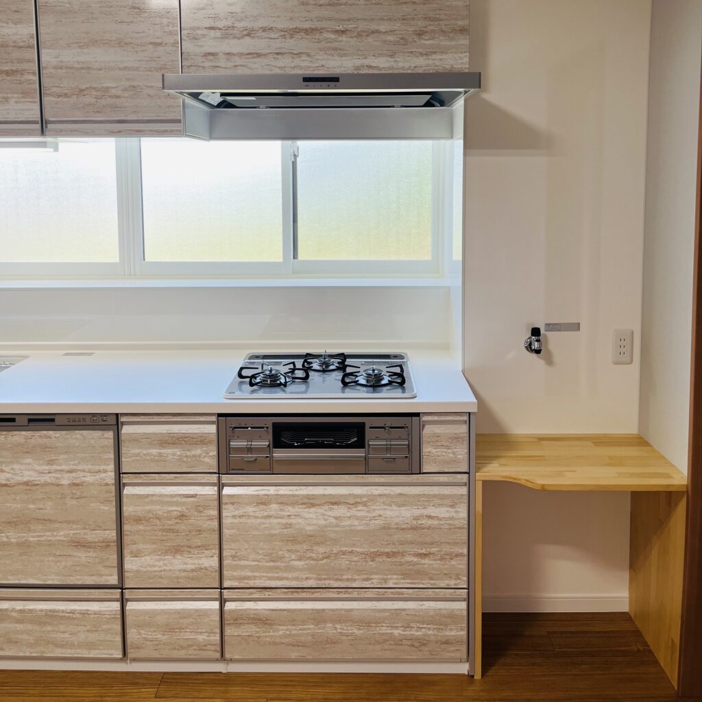 小千谷の家 \ キッチン / 【BEFORE】 【AFTER】 お客様のご希望で換気扇は通常より少し高い位置に設置!より快適に仕上がりました♪ 左側には収納スペース、右側にはガス釜スペースを確保しました◎ レイアウトは自由に!移動可能な収納カウンターを造作♪